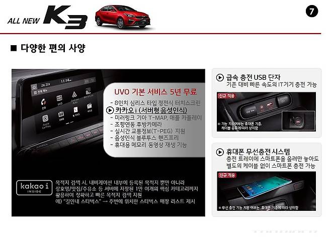 AI 기반 서버형 음성인식 기술인 '카카오 I(아이) 적용을 통해 운전 편의성을 강화했다. 카카오 I(아이)는 5년간 무료 이용 가능한 UVO 내비게이션에 적용되며 검색 편의성과 정확성을 높여준다. 또한 급속충전 USB 단자, 휴대폰 무선충전 시스템을 적용했다.