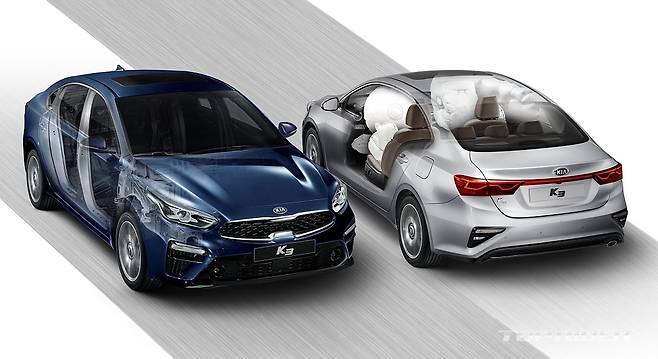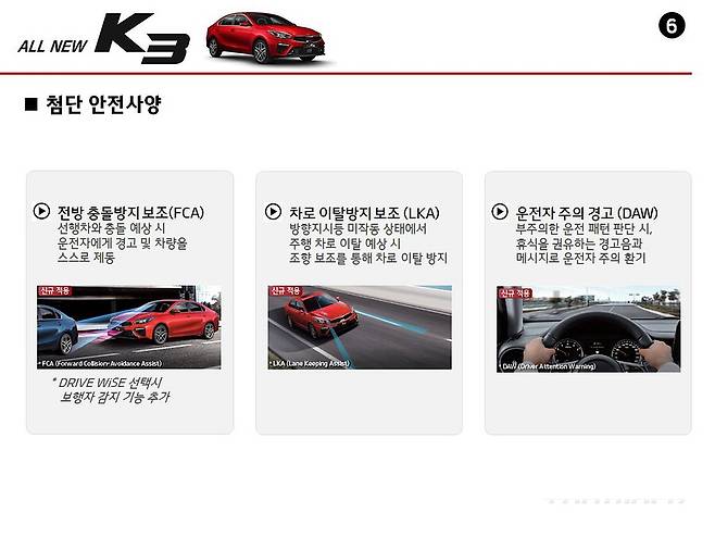 올 뉴 K3에는 전방 충돌방지 보조(FCA, 차량감지)를 기본 장착했으며 운전자 주의 경고(DAW), 차로 이탈방지 보조(LKA), 후측방 충돌 경고(BCW) 등을 적용해 사고 발생을 미연에 방지하는 능동적 안전성을 크게 높였다.