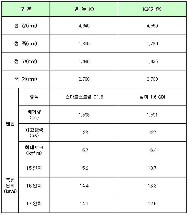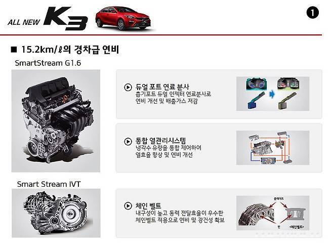 올 뉴 K3에는 스마트스트림 G1.6 MPI 엔진과 IVT 무단변속기가 조합돼 최고출력 123마력, 최대토크 15.7kgm를 발휘한다. 복합 연비는 15.2km/ℓ(15인치 타이어 기준)로 경차급 연비를 인증받았다. 이는 기존 K3 모델 대비 약 10% 이상 개선된 수치다.