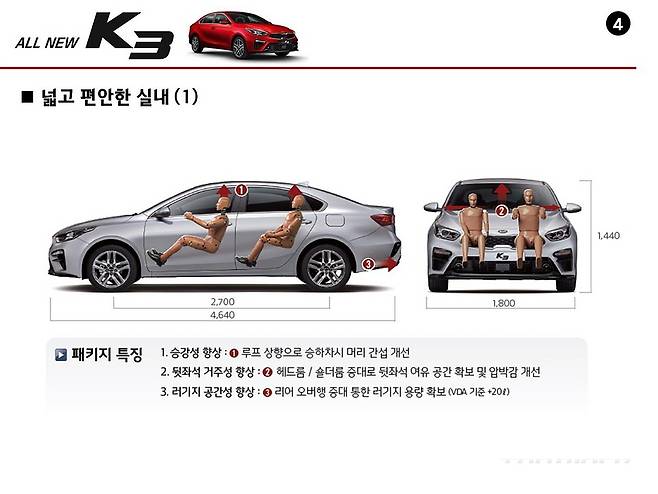 올 뉴 K3는 기존 모델보다 커진 전장 4640mm, 전폭 1800mm, 전고 1440mm, 휠베이스 2700mm의 차체를 확보했다. 이는 기존 K3의 전장 4560mm, 전폭 1780mm, 전고 1435mm, 휠베이스 2700mm 대비 휠베이스를 제외한 모든 수치가 확대된 것이다.