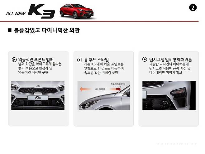 지난 1월 15일 디트로이트 모터쇼에서 최초 공개된 올 뉴 K3(해외명 포르테)는 볼륨감 있고 다이나믹한 외관으로 '리틀 스팅어'라는 호평을 받은 바 있다. 올 뉴 K3는 기존의 다이나믹한 디자인 콘셉트에 볼륨감과 고급감을 더해 업스케일 이미지를 완성했다.