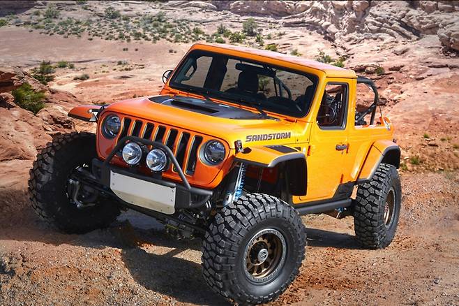 지프 샌드스톰은 바하(Baja) 사막 레이서에서 영감을 받은 차량이다. 거친 사막길에 최적화된 모델이지만 일상적인 드라이빙에도 손색이 없다. 5.68의 기어비, 17인치의 비드록 휠과 39.5인치 타이어, 6.4리터 V-8 엔진 등 극한의 서스펜션 시스템과 파워 트레인을 갖춘 것이 특징이다.