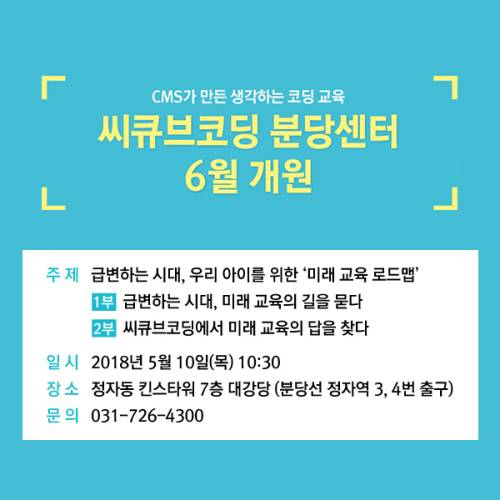 CMS에듀가 만든 코딩교육 전문 브랜드 씨큐브코딩(C³ coding)이 6월 분당센터 개원을 앞두고 5월 10일(목) 정자동 킨스타워 7층 대강당에서 학부모 설명회를 개최한다고 밝혔다.