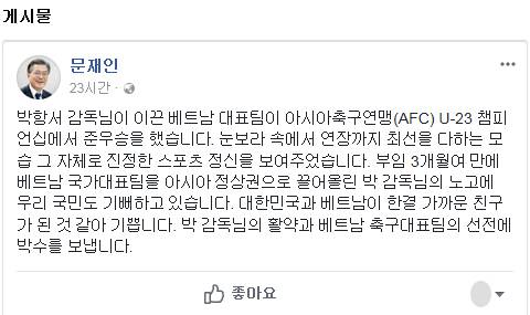 한편 이날 문재인 대통령도 SNS를 통해 “(박항서 감독과 베트남 대표팀이) 눈보라 속에서 연장까지 최선을 다하는 모습 그 자체로 진정한 스포츠 정신을 보여줬다”며 “부임 3개월여 만에 베트남 국가대표팀을 아시아 정상권으로 끌어올린 박 감독님의 노고에 우리 국민도 기뻐하고 있다”고 밝혔다.