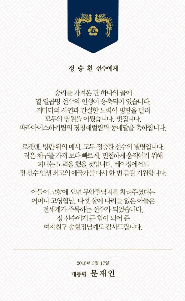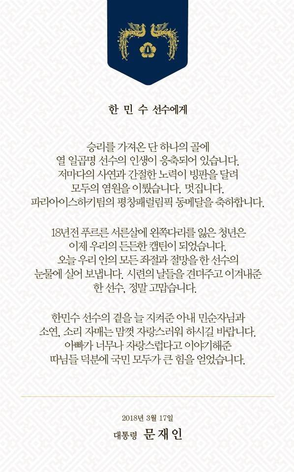 "승리를 가져온 단 하나의 골에 열 일곱명 선수의 인생이 응축되어 있다"라는 서두와 "파라아이스하키팀의 평창 패럴림픽 동메달을 국민과 함께 축하한다"라는 결말만 같았을 뿐이다. 나머지 내용에는 선수들의 사연은 물론 가족들의 이름까지 하나하나 호명하며 '특별한' 감동을 선사했다.