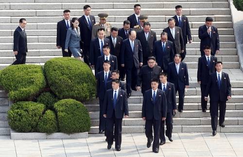 김정은이 판문점 북측 지역 판문각에 모습을 드러내기 전부터 양복을 입은 북측 경호원들이 판문각 앞을 지키고 서 있었다. 평소에는 철모를 쓴 군인 한 사람이 판문각을 지킨다. 김정은은 이날 오전 9시27분 공식 수행단원과 함께 10여명의 경호원들과 판문각에서 나왔다. 경호원들은 옷차림은 까만 양복에 파란색 같은 넥타이를 매고 있었다. 귀 옆을 짧게 친 헤어스타일도 비슷했다. 이들은 인민군 소속인 것으로 전해진다.