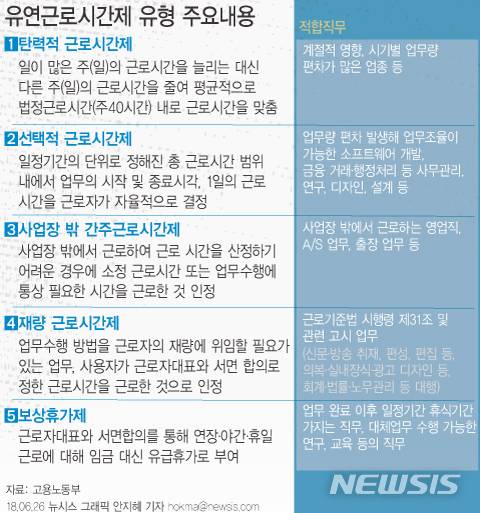 이날 정부가 공개한 매뉴얼의 유연근로제 종류는 크게 탄력적 근로시간제(근로기준법 제51조), 선택적 근로시간제(근로기준법 제52조), 사업장 밖 간주근로시간제(근로기준법 제58조제1·2항), 재량 근로시간제(근로기준법 제58조제3항), 보상휴가제(근로기준법 제57조) 등 5가지다.