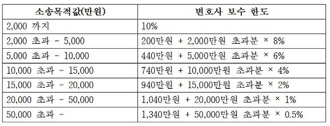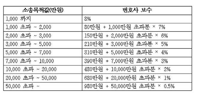 구체적으로, 소송에서 패소한 당사자가 부담하게 될 변호사보수는 승소한 당사자가 변호사에게 착수금 또는 성공보수 등으로 지급한 또는 지급할 보수액이 전부 무제한으로 인정되는 것이 아니라, 소송목적의 값에 따라 변호사보수의 소송비용 산입에 관한 규칙 제3조 별표의 기준(아래에 첨부한 표)에 의하여 산정한 금액을 한도로 한다.