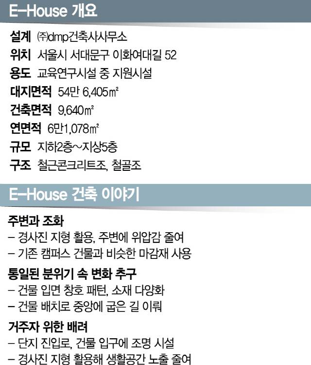 지난 2016년 8월 완공된 이화여대 기숙사 E-House는 지하 2층~지상 5층의 건물 8개 동으로 구성됐다. 기숙사 부지는 원래 경사진 지형에 나무가 빽빽하게 들어서 있는 숲이었다고 한다. 이 때문에 설계자인 피터 최 dmp건축사사무소 부사장은 이러한 부지의 지형, 주변 환경과의 조화에 초점을 맞췄다.