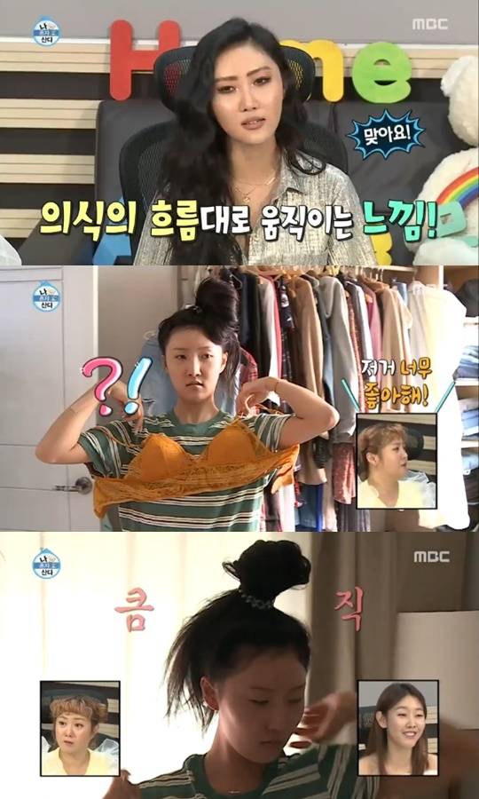 밥을 해 먹는 스타일이 아니라는 화사는 거실에 놓인 침대 위에서 시리얼을 먹으며 영화를 시청했다. 심지어 침대 위에서 쿨하게 발을 벅벅 긁기도 했다. 화사의 털털한 모습에 패널들은 "여자 기안이다"며 폭소했다.
