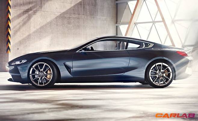 옆모습에서는 새로 디자인 된 커다란 알로이 투톤 휠을 볼 수 있다. 8시리즈 컨셉트에서 봤던 그 디자인이다. 휠 안에는 푸른 브레이크 캘리퍼가 자리하고 있으며, 앞 펜더 뒤로 공기 배출구(에어브리더)도 보인다. 8시리즈 컨셉트와 최대한 비슷한 모습을 가져왔다.
