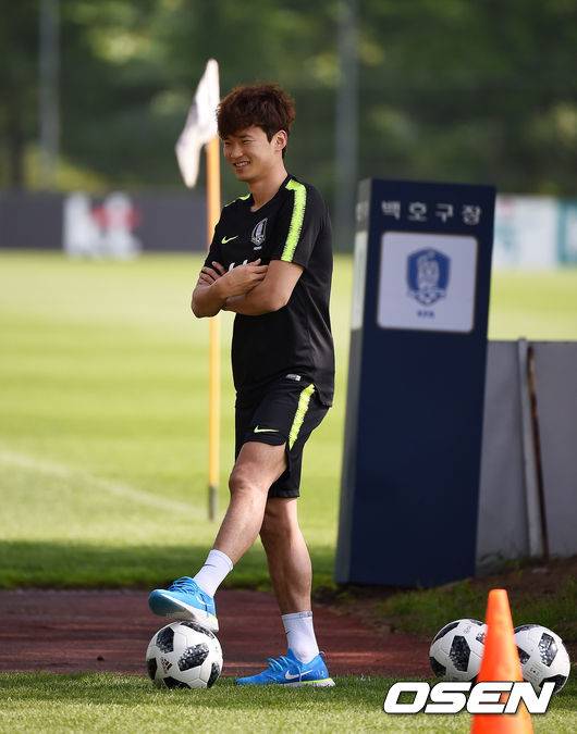[OSEN=파주, 지형준 기자] 24일 오후 경기도 파주 축구국가대표팀트레이닝센터(NFC)에서 열린 '2018 러시아월드컵' 대한민국 축구대표팀 공식훈련에서 김진수가 재활을 하며 훈련장에 모습을 보이고 있다. /jpnews@osen.co.kr