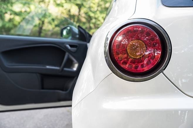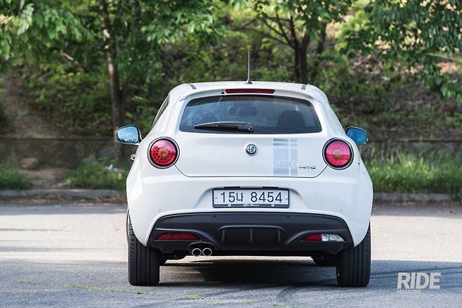 뒷모습은 고성능을 의식해서 트렁크의 크기가 작고 높이도 높다. 트렁크 열림 버튼은 알파 로메오 앰블럼이 대신한다. 트렁크 위쪽으로는 스포일러가 작게 자리잡았다. 스포일러 아래에는 보조제동등이 위치했다. 후미등과 방향지시등은 원형으로 LED를 배치해서 고성능을 강조했다. 범퍼 아래쪽에는 리어 디퓨저가 작게 자리잡았고, 좌우로 각각 안개등과 후진등을 배치했다. 배기팁은 한쪽으로 쏠려서 두 개로 나오는데, 요즘 차들에 비하면 구경이 작아서 무척 귀엽다. 전체적으로 엉덩이가 들려있고, 콤팩트하면서도 단단한 느낌이다.