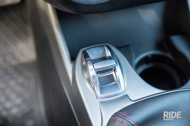 스티어링은 조금 직경이 크다. 덕분에 기어비가 짧지만 섬세한 조작이 가능하다. 스티어링에는 간단하게 볼륨과 통화, 업다운 선택버튼이 있다. 변속레버는 가죽으로 감싸져있고, 각 단의 스트로크가 조금 길다. 차량의 특성상 쉬프트 미스를 방지하기 위해 길게 설정된 것 같다. 케이블 방식이라 주행중 떨림이나 잡음을 내지는 않았다.