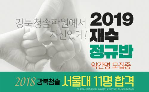 이투스교육㈜에서 운영하는 재수종합학원 강북청솔학원에서 2019학년도 재수정규반을 2월 19일(월)에 개강하고 결원생 약간명을 추가 모집한다.