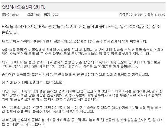 이에 대해 홍성지 9단은 지난 17일 한국 바둑 사이트인 '사이버오로'에 해명 글을 올렸다. 홍 9단은 "한큐바둑 아이디 삭제에 대한 내용을 알게 된 것은 6월 10일 중국 출국 길에서였다"며 "이야기를 듣고 강력하게 해명하지 못했던 것은 한 번의 대국에서 대국 도중에 변화에 대해 알아보고 싶다는 생각이 들어 AI를 사용한 적이 있었기에 양심에 가책을 느껴 해명을 하지 못했다"라고 설명했다.