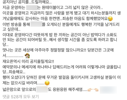 공지를 올린 김현우는 "행여 오셨다가 닫힌 문에 무거운 발걸음 돌이키시며 고생하실 분들이 이제는 없으시길 바란다"며 "넓은 마음으로 앞으로의 식당도 응원 해달라"고 글을 마무리 지었다.