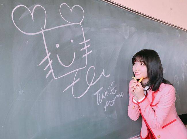 공개된 사진 속에는 광고촬영이 진행된 학교 교실의 칠판 앞에서 꽃받침을 하는 등 다양한 포즈를 취하고 있는 모모의 모습이 담겨 있다. 모모는 핑크색 교복까지 완벽 소화하며 미모를 발산했다.