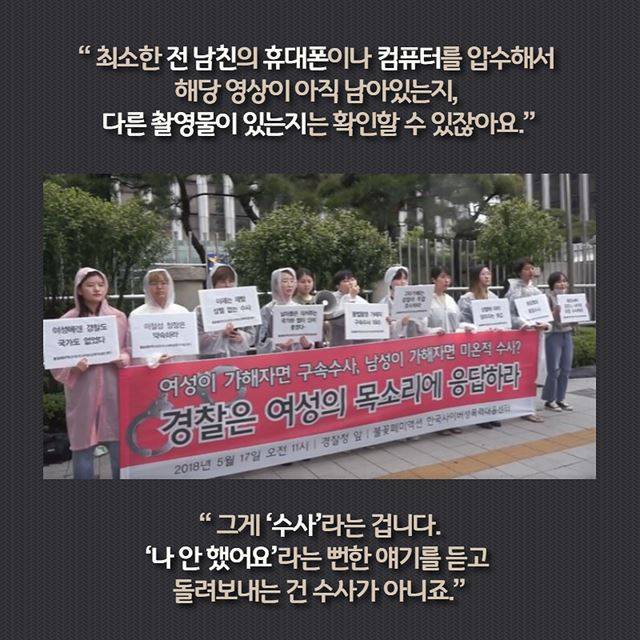 “최소한 가해자로 추정되는 전 남자친구의 휴대폰이나 컴퓨터를 압수해서 해당 영상이 아직 남아있는지, 다른 촬영물이 있는지는 확인할 수 있잖아요. 그게 ‘수사’라는 겁니다. ‘나 안 했어요’라는 뻔한 얘기를 듣고 돌려보내는 건 수사가 아니죠.”