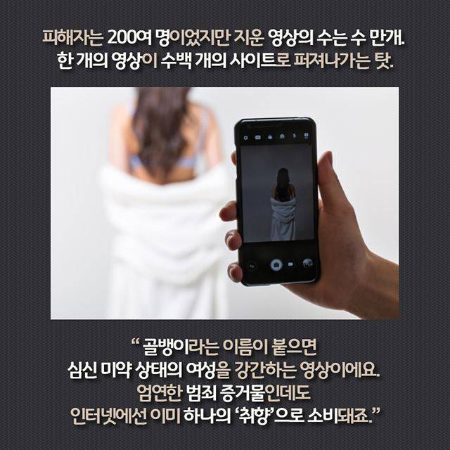 피해자는 200여 명이었지만 지운 영상의 수는 수 만개. 한 개의 영상이 수백 개의 사이트에 동시다발적으로 퍼져나가는 탓. " ‘골뱅이’라는 이름이 붙으면 만취한 심신 미약 상태의 여성을 강간하는 영상이에요. 엄연한 범죄 증거물인데도 인터넷에선 이미 하나의 ‘취향’으로 소비되고 있죠.”