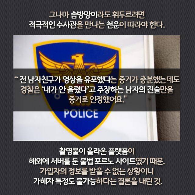 그나마 솜방망이라도 휘두르려면 적극적인 수사관을 만나는 천운이 따라야 한다.“ 전 남자친구가 영상을 직접 유포했다는 정황적 증거가 충분했는데도 경찰은 ‘내가 안 올렸다’고 주장하는 남자의 진술만을 증거로 인정했어요." 촬영물이 올라온 플랫폼이 해외에 서버를 둔 불법 포르노 사이트였기 때문. 가입자의 정보를 받을 수 없는 상황이니 가해자 특정도 불가능하다는 결론을 내린 것.