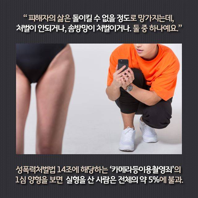 “피해자의 삶은 돌이킬 수 없을 정도로 망가지는데, 처벌이 안되거나, 솜방망이 처벌이거나. 둘 중 하나예요.”성폭력처벌법 14조에 해당하는 ‘카메라등이용촬영죄’의 1심 양형을 살펴보면 실형을 산 사람은 전체의 약 5%에 불과.
