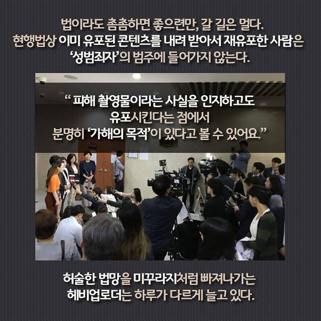법이라도 촘촘하면 좋으련만, 갈 길은 멀다. 현행법상 이미 유포된 콘텐츠를 내려 받아서 재유포 한 사람은 ‘성범죄자’의 범주에 들어가지 조차 않는다. “ 피해 촬영물이라는 사실을 인지하고도 유포시킨다는 점에서 분명히 ‘가해의 목적’이 있다고 볼 수 있어요.” 허술한 법망이 방치되는 사이 미꾸라지처럼 빠져나가는 헤비업로더는 하루가 다르게 늘고 있다.