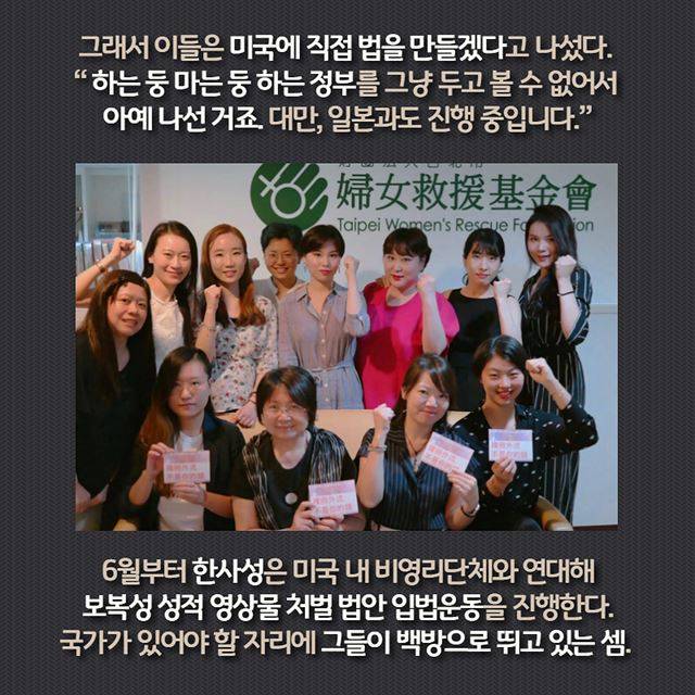 그래서 이들은 미국에 직접 법을 만들겠다고 나섰다. “하는 둥 마는 둥 하는 정부를 그냥 두고 볼 수 없어서 아예 나선 거죠. 대만, 일본과도 진행 중입니다.” 6월부터 한사성은 미국 내 비영리단체와연대해 보복성 성적 영상물 처벌 법안 입법운동을 진행한다. 국가가 있어야 할 자리에 그들이 백방으로 뛰고 있는 셈.