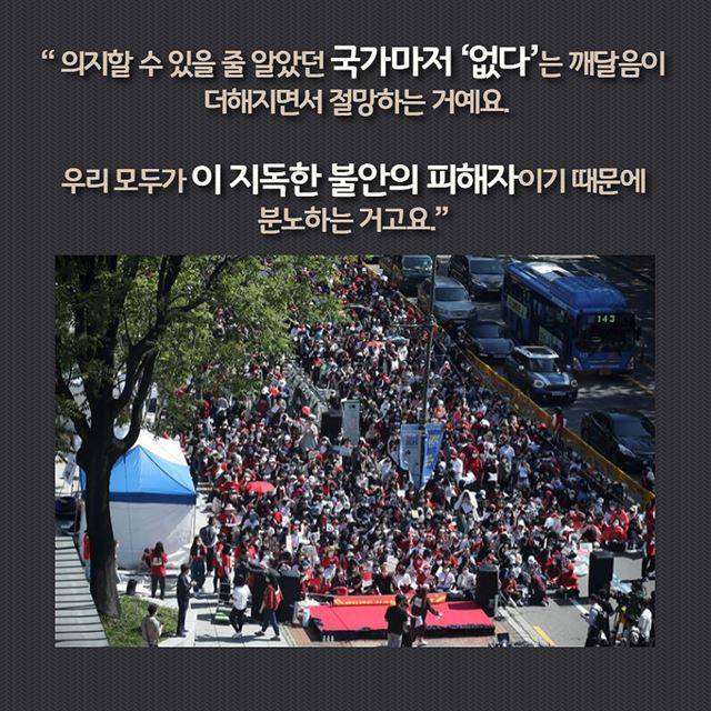 의지할 수 있을 줄 알았던 국가마저 ‘없다’는 깨달음이 더해지면서 절망하는 거예요.우리 모두가 이미 이 지독한 불안의 피해자이기 때문에 분노하는 거고요.”