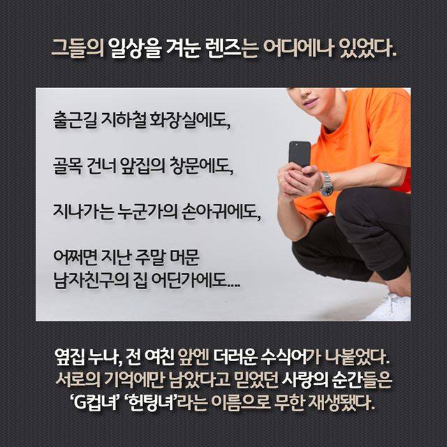 그들의 일상을 겨눈 렌즈는 어디에나 있었다. 출근길에 잠시 들른 지하철 화장실에도, 골목 건너 앞집의 창문에도, 지나가는 누군가의 손아귀에도, 어쩌면 지난 주말 머문 남자친구의 집 어딘가에도.옆집 누나, 전 여친, 여동생 앞에 더러운 수식어가 나붙었다. 서로의 기억에만 남았다고 믿었던 사랑의 순간들은 ‘G컵녀’ ‘헌팅녀’라는 이름으로 무한 재생됐다.