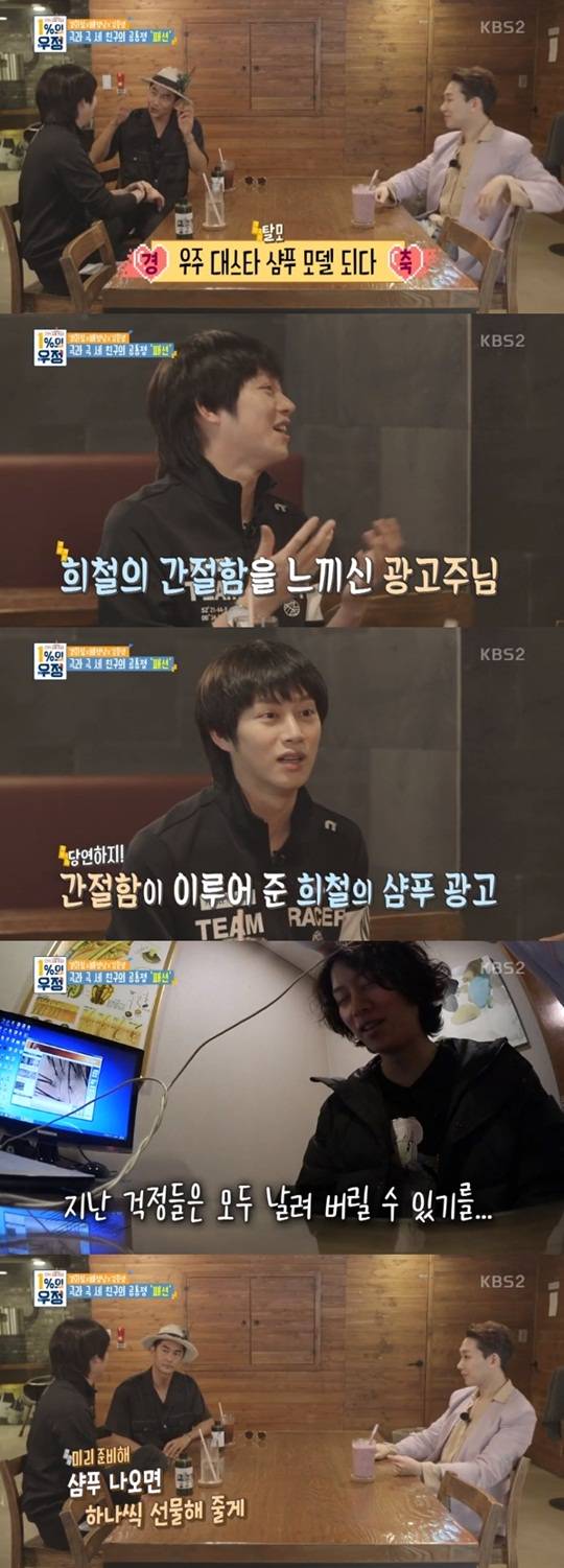 김희철은 "프로그램에서 탈모 고백 후에 샴푸 광고가 들어왔다"고 말해 모두를 놀라게 했다. 이어 "광고 관계자가 내 진실된 모습이 좋았다고 하더라. 탈모 효과는 좋은데 아이돌이라 이미지가 괜찮냐고 물어보더라"며 "샴푸 나오면 하나씩 선물해주겠다"고 말해 웃음을 자아냈다.