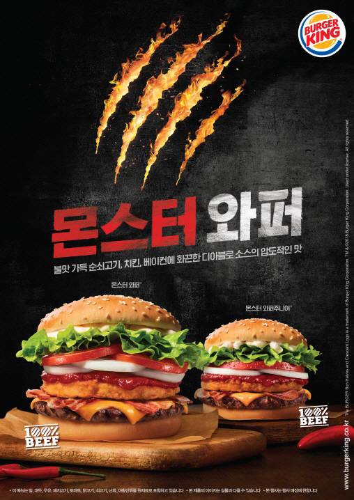 '몬스터와퍼'는 버거킹 코리아의 자체 개발 메뉴로 직화로 구운 100% 순쇠고기 패티와 크리스피 치킨패티, 베이컨까지 세 가지 고기 맛이 매콤한 디아블로 소스와 어우러진 프리미엄 버거다.