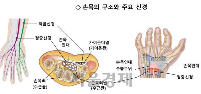 손목 터널은 손목 앞쪽 피부조직 밑에 9개의 힘줄과 정중신경 등이 지나가는 뼈·인대구조물이다. 과도한 손목 사용으로 근육·인대에 염증이 생기면 터널을 덮고 있는 인대구조물이 붓고 두꺼워져 정중신경을 눌러 손목, 손바닥, 엄지·검지·중지와 약지 일부에 통증·저림·감각저하 증상이 나타난다.