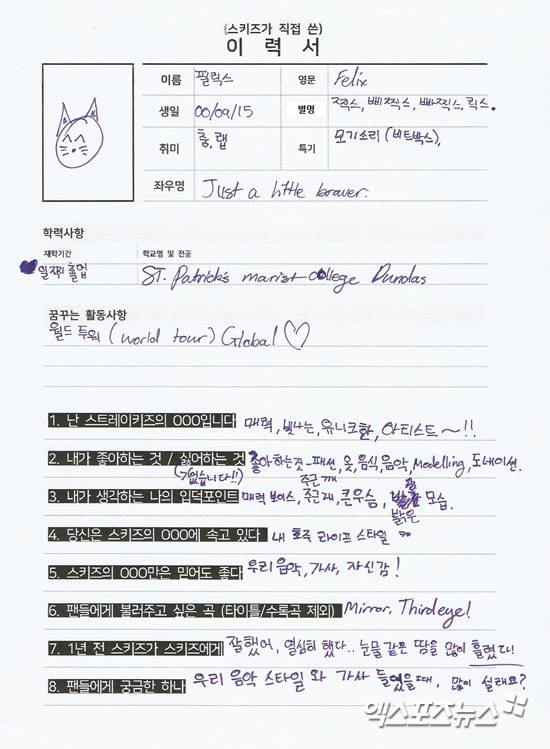 A. 다 멤버들이 지어줬어요. 삐지면 삐직스, 화나면 빠직스, 그냥 있을 땐 찍스 등등.. 별명이 셀 수 없이 많아요. 그냥 필릭스라고 부를 때가 거의 없는 것 같아요. 그래도 이 별명들 다 좋아요.