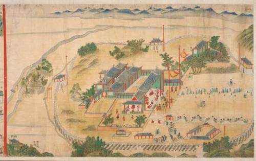| 과거시험장의 풍경을 그린 혜촌 김학수의 ‘과거 시험장’. 이야기를 나누거나 무언가를 쓰는 사람, 그것을 지켜보는 사람 등 시험장의 다양한 모습을 담았다. 국립민속박물관 제공 |