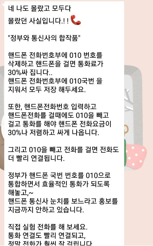 이 글은 010을 빼고 걸면 통화요금이 30% 할인되므로 전화번호부에 010 국번을 모두 지워서 저장해둘 것을 당부한다.