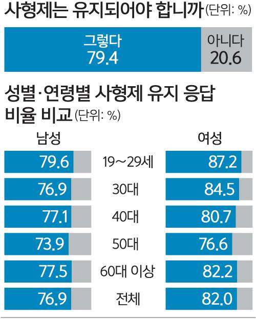 세계일보가 지난해 9월 여론조사업체에 의뢰해 전국의 19세 이상 남녀 1000명을 대상으로 실시한 여론조사(온라인+모바일 조사, 신뢰수준 95%, 표집오차 ±3.1%)에 따르면 국민의 79.4%가 ‘사형제를 유지해야 한다’는 의견을 가진 것으로 나타났다. 같은 숫자의 응답자들이 ‘사형 집행도 이뤄져야 한다’는 의견을 밝혔고, 사형제 반대 의견은 20.6%에 그쳤다.