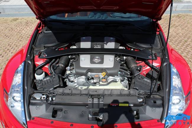 닛산 370Z의 심장은 VQ37VHR 엔진이다. 333마력/7,000rpm의 최고출력과 37kg.m/5,200rpm의 최대토크 성능을 지닌 이 엔진은 보어(실린더 내경)가 95.5mm에 스트로크(행정 길이)는 86mm인 숏 스트로크 엔진으로, 7,000rpm 이상의 고회전 영역을 사용할 수 있다. 시간이 지날수록 다운사이징 등의 미명 하에 점점 사라져만 가고 있는 대배기량 고회전 자연 흡배기 엔진이라는 점만으로도 매력적인 엔진이다.