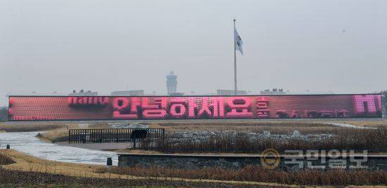 T2 연결도로에 잘 진입했다면 공항에서 익숙하게 마주치는 여행객 모습을 재현한 조각작품 '하늘을 걷다'를 가장 먼저 마주하게 된다. 매끈한 도로를 한참 더 달리면 T2가 나온다. T2 앞에서는 최신 공항 임을 강조하듯 대형 전광판이 '안녕하세요' 하고 인사를 건넨다.