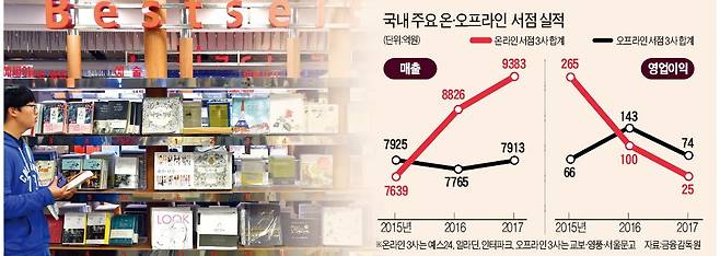 독서율이 떨어지고 도서구입비 지출이 줄고 있는 가운데서도 2000년대 온라인 서점의 성장세는 가팔랐다. ‘오프라인에서 보고 온라인에서 산다’는 소비의 흐름이 책을 구입하는 데도 적용된 결과다. 2015년 이후 교보·영풍·서울문고 등 오프라인 서점 3사의 매출은 제자리걸음 했지만 온라인은 연간 10% 안팎의 성장세를 보였다. 2016년 처음으로 온라인 서점 3사의 매출(8826억원)이 오프라인(7765억원)을 넘었고 지난해(9383억원)에는 처음 9000억원을 돌파했다. 오프라인 3사와의 격차는 1470억원으로 더 벌어졌다. 하지만 영업이익은 오프라인 3사(74억원)의 3분의 1에 불과했다. 온라인 서점의 평균 영업이익률은 0.27%를 기록했다.