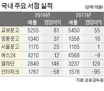 16일 금융감독원 전자공시시스템에 따르면 지난해 예스24와 알라딘, 인터파크(도서부문) 등 국내 3대 온라인 서점의 매출은 총 9383억원으로 전년(8826억원)보다 6.31% 증가했다. 같은 기간 영업이익은 100억원에서 25억원으로 4분의 1토막 났다. 예스24가 9억원의 영업손실을 내며 적자로 돌아선 데다 인터파크 도서부문의 적자 규모가 2016년 58억원에서 95억원으로 늘어났기 때문이다. 3사 중 알라딘만 흑자 기조를 유지했다. 지난해 129억원으로 전년(146억원)보다 영업이익 규모가 줄었지만 온·오프라인을 통틀어 유일하게 100억원이 넘는 영업이익을 올렸다. 전국 41곳에 이르는 오프라인 중고서점과 매장 내 굿즈(goods·관련 상품) 인기가 실적에 기여했다.