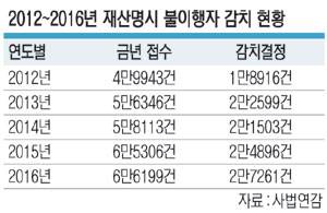 ◇5년간 매년 2만 명 이상 감치 = 1일 제윤경 더불어민주당 의원이 법원행정처로부터 제출받은 사법연감 등 통계 자료에 따르면 재산명시 불이행 감치 결정은 2012년 1만8916건에서 2013년 2만2599건, 2014년 2만1503건, 2015년 2만4896건, 2016년 2만7261건으로 꾸준히 증가하고 있다. 재산명시 불이행에 따른 감치 대상은 전체 감치 결정자의 대부분을 차지한다. 2016년에 감치 결정을 받은 2만7505명 중 재산명시 불이행자가 절대다수인 99.1%였다. 법정질서유지(법원조직법), 가사소송사건의 각종 명령(가사소송법) 등에도 감치 제도가 규정돼 있지만 매년 실제 집행되는 것은 수십 명 수준에 머물고 있는 것에 비하면 재산명시 불이행 감치 결정이 지나치게 남용되는 셈이다.