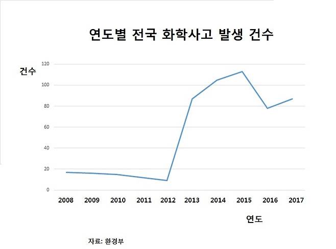 구미 불산 사고가 일어난 2012년까지만 해도 연간 화학사고 발생 건수는 20건을 밑돌았다.