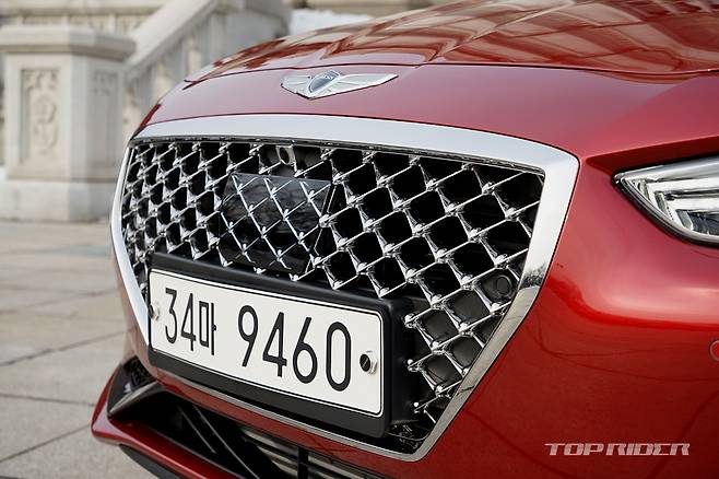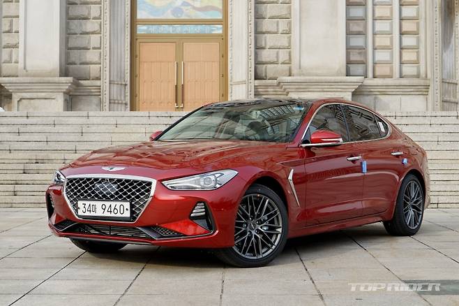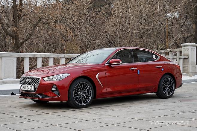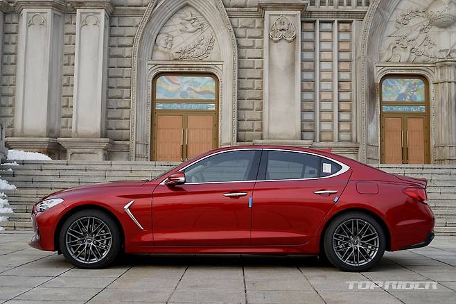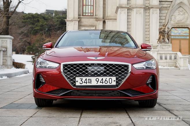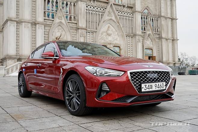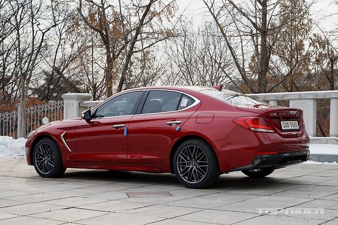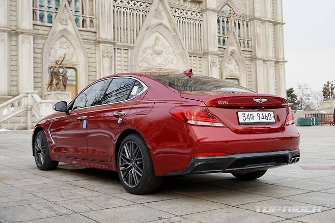 시승차에 적용된 블레이징 레드는 G70 외장컬러 중 가장 매력적이라고 생각되는데, 흐린 하늘 아래서는 마치 버건디 컬러처럼 차분하게 보여진다. 블레이징 레드를 적용하기 위해서는 여러 도색 공정이 추가되는데 가격이 더해지지 않아 공짜처럼 느껴진다.