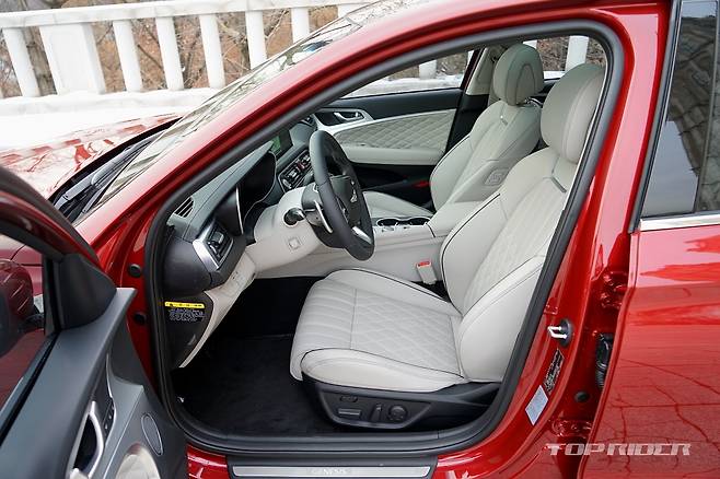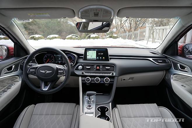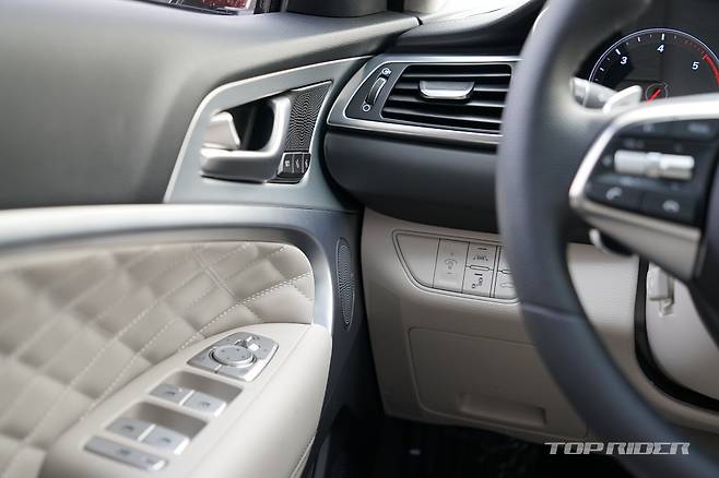 시그니처 디자인 셀렉션이 적용된 시승차의 실내는 크림색 퀼팅 나파가죽과 스웨이드 헤드라이닝이 적용돼 고급스러움이 강조됐다. 상급 모델인 G80 보다도 고급스럽게 느껴진다. 더러워지기 쉬운 곳에 어두운 컬러가 적용됐음에도 조화롭게 완성했다.