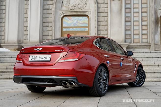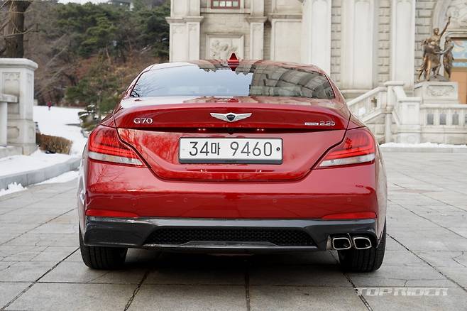 제네시스 G70 라인업 중 외관상 디젤임을 알 수 있는 표식은 머플러팁이다. 듀얼 머플러가 적용된 가솔린 라인업과 달리 G70 디젤에는 싱글 트윈 머플러팁이 적용됐다. 다소 과하게 느껴지는 19인치 휠 대신 적용된 멀티핀 타입 18인치 휠은 매력적이다.