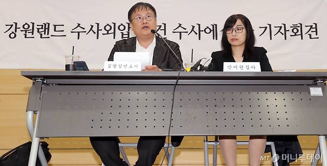 강원랜드 채용비리 수사외압을 제기한 김필성 변호사, 안미현 검사가 15일 오전 서울 서초구 변호사교육문화관에서 '강원랜드 수사외압 사건 수사에 관한 기자회견'을 열고 발언하고 있다.