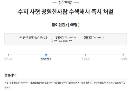 그러나 반대로 이번엔 "수지 사형 청원한 사람 수색해 즉시 처벌"이라는 제목의 청원이 등장했다.