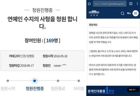 이후 청와대 국민청원 페이지엔 '연예인 수지의 사형을 청원 합니다'라는 제목의 청원이 올라왔다.