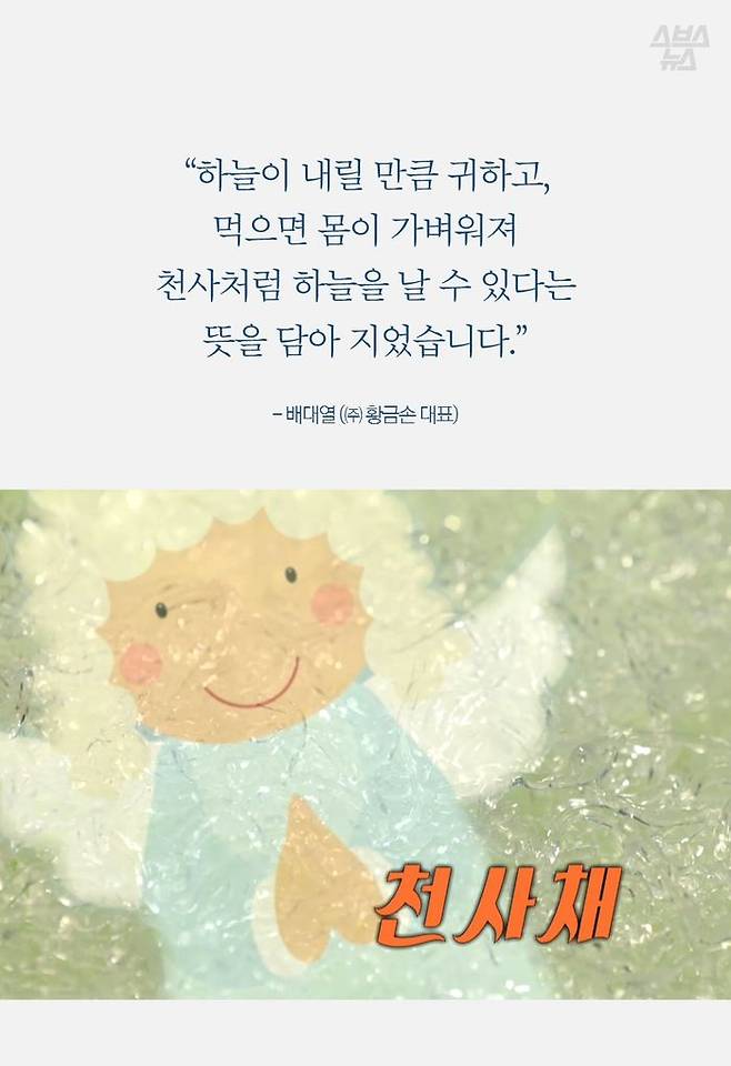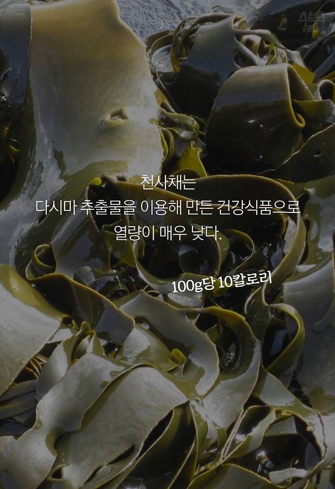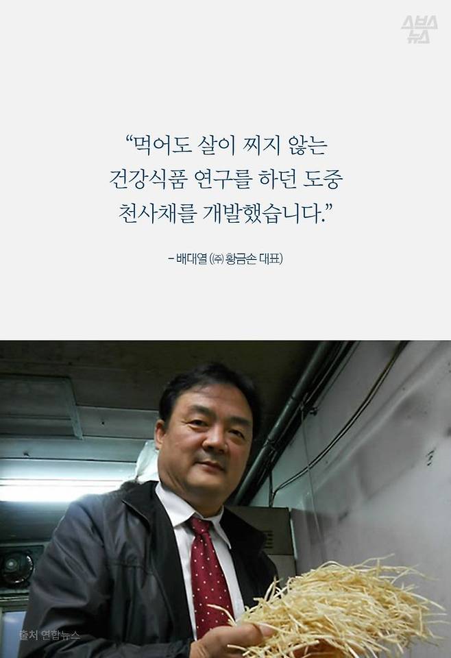 천사채의 개발자 배대열 씨는 20년 전 다시마 추출물인 알긴산을 활용해 천사채를 만들었습니다. 낮은 칼로리로 높은 포만감을 주는 천사채는 건강식품을 목적으로 개발됐지만, 기존에 회 밑을 장식하기 위해 쓰였던 무채보다 저렴해 대신 쓰이고 있습니다.